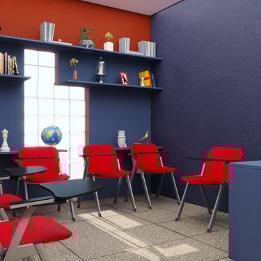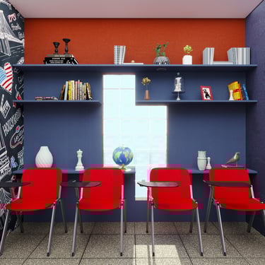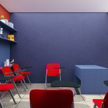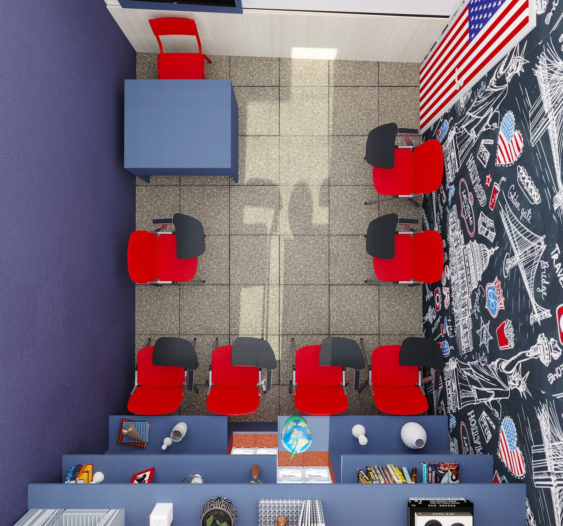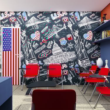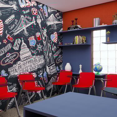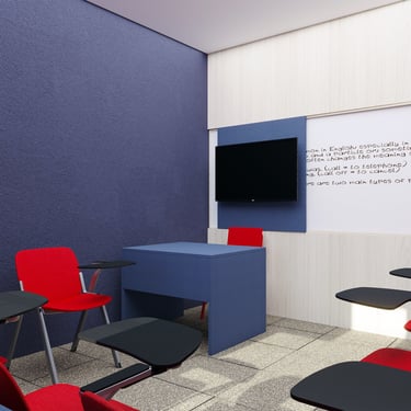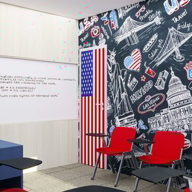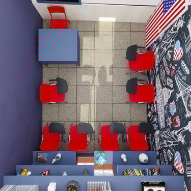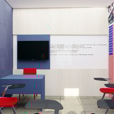 Projeto de Interiores para a Prime English School - Feira de Santana - Bahia - A sala de Aula 01 recebeu a temática do país, Estados Unidos da América, e todo o projeto foi desenvolvido em volta disso, as portas de cada sala foram plotadas conforme a temática planejada para ela, recebendo um papel de parede temático e uma painel de mdf para poder-se passar a elétrica, organizando melhor as tomadas e instalando novas, o quadro foi planejado para ficar centralizado entre dois painéis em mdf, foi planejado também um painel de correr que irá receber a tv, podendo ficar posicionado aonde for melhor conforme as posições dos alunos da sala e paleta de cores seguindo sempre o padrão de cores da logo. Essa sala os móveis em mdf foram pensado de uma forma que não obstruisse a passagem da luz natural.