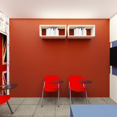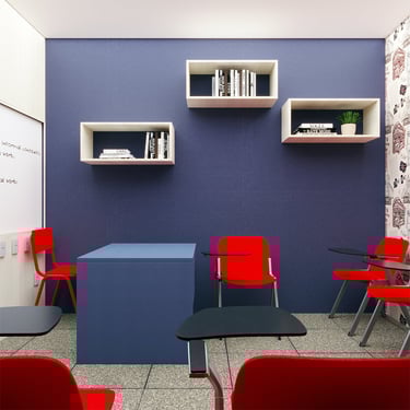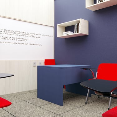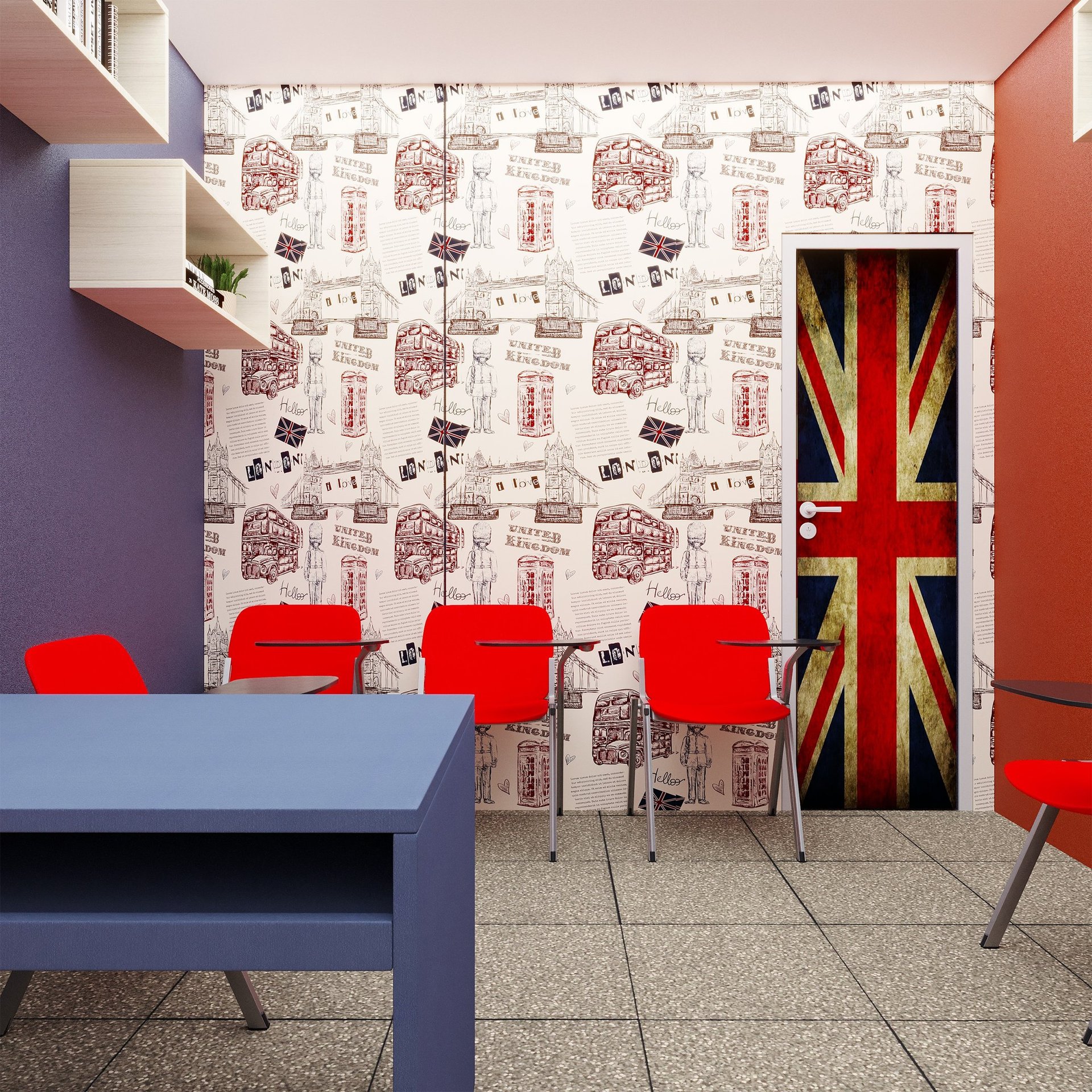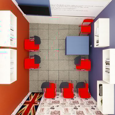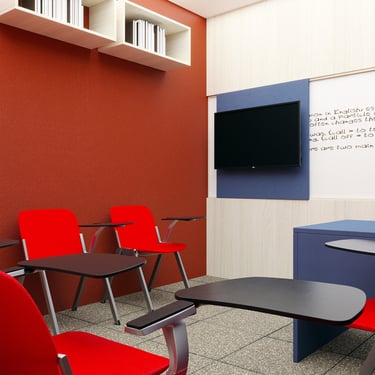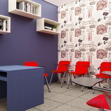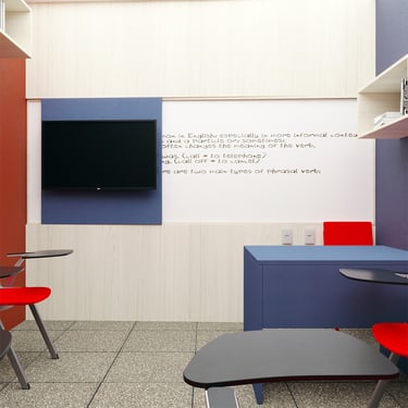 Projeto de Interiores para a Prime English School - Feira de Santana - Bahia - A sala de Aula 02 recebeu a temática do país, Inglaterra, e todo o projeto foi desenvolvido em volta disso, as portas de cada sala foram plotadas conforme a temática planejada para ela, recebendo um papel de parede temático e uma painel de mdf para poder-se passar a elétrica, organizando melhor as tomadas e instalando novas, o quadro foi planejado para ficar centralizado entre dois painéis em mdf, foi planejado também um painel de correr que irá receber a tv, podendo ficar posicionado aonde for melhor conforme as posições dos alunos da sala e paleta de cores seguindo sempre o padrão de cores da logo, o local onde foi aplicado o papel de parede é um painel com uma porta camuflada para esconder o acesso de um banheiro desativo, por se tratar de um local alugado não dá para se ter intervenções na estrutura, aí adotamos soluções para a situação.