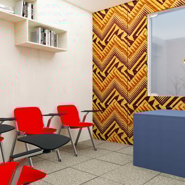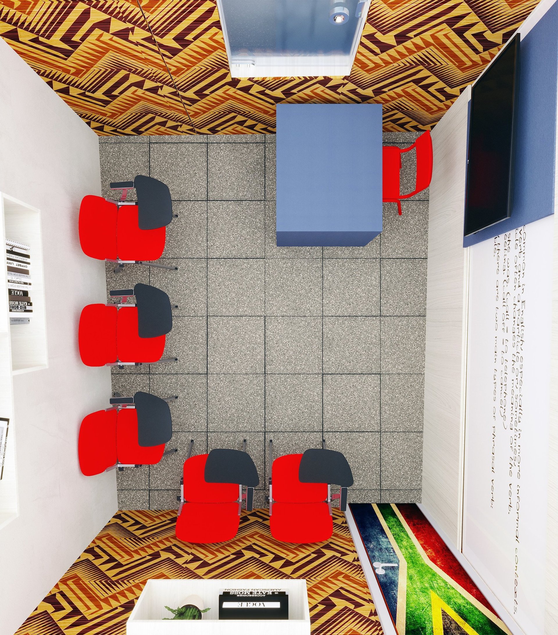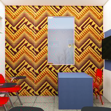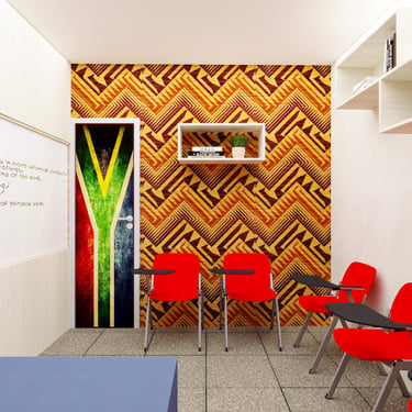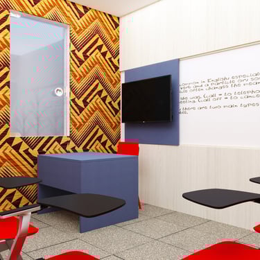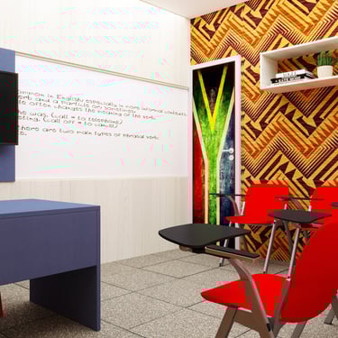 Projeto de Interiores para a Prime English School - Feira de Santana - Bahia - A sala de Aula 03 recebeu a temática do país, South Africa, e todo o projeto foi desenvolvido em volta disso, as portas de cada sala foram plotadas conforme a temática planejada para ela, recebendo um papel de parede temático e uma painel de mdf para poder-se passar a elétrica, organizando melhor as tomadas e instalando novas, o quadro foi planejado para ficar centralizado entre dois painéis em mdf, foi planejado também um painel de correr que irá receber a tv, podendo ficar posicionado aonde for melhor conforme as posições dos alunos da sala e paleta de cores seguindo sempre o padrão de cores da logo, um dos locais onde foi aplicado o papel de parede é um painel com uma porta camuflada para esconder o acesso de um banheiro desativo, por se tratar de um local alugado não dá para se ter intervenções na estrutura, aí adotamos soluções para a situação, não obstruindo a passagem da iluminação natural.