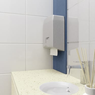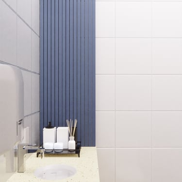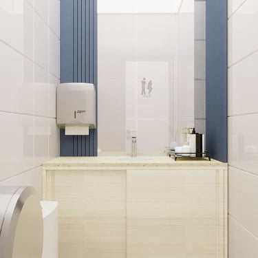 Projeto de Interiores para a Prime English School - Feira de Santana - Bahia - Esse lavabo foi planejado para trazer sofisticação, organização junto com uma paleta de cores neutras, trazendo referência a logo, mais uma vez trazendo essa associação a cor.