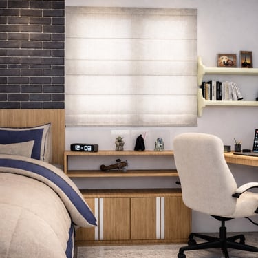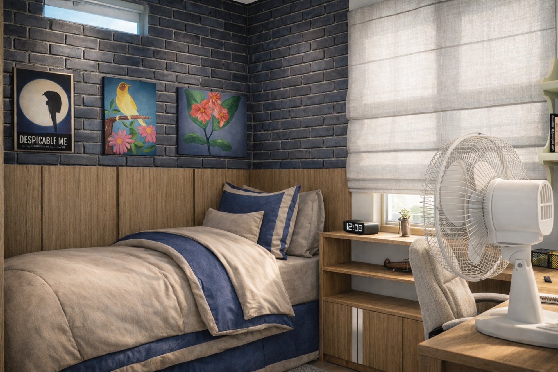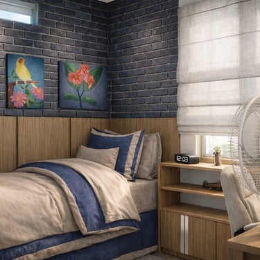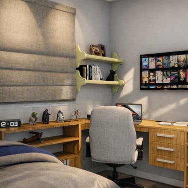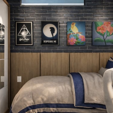 Projeto de arquitetura de interiores para uma intervenção no de um quarto de um jovem, levando em consideração o rústico e todo seu entorno em harmonia, pôsteres e pinturas já eram usados nessa parede, trazendo algo jovial e moderno, organizando o quarto da melhor forma possível para poder se organizar todos os seus pertences,