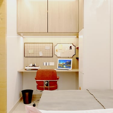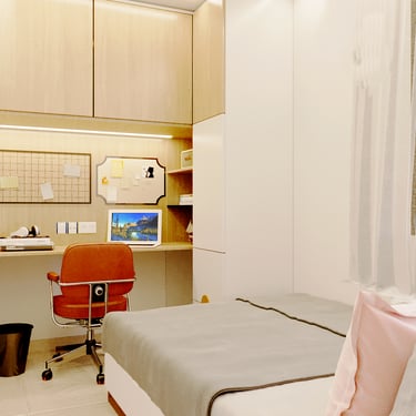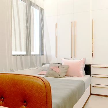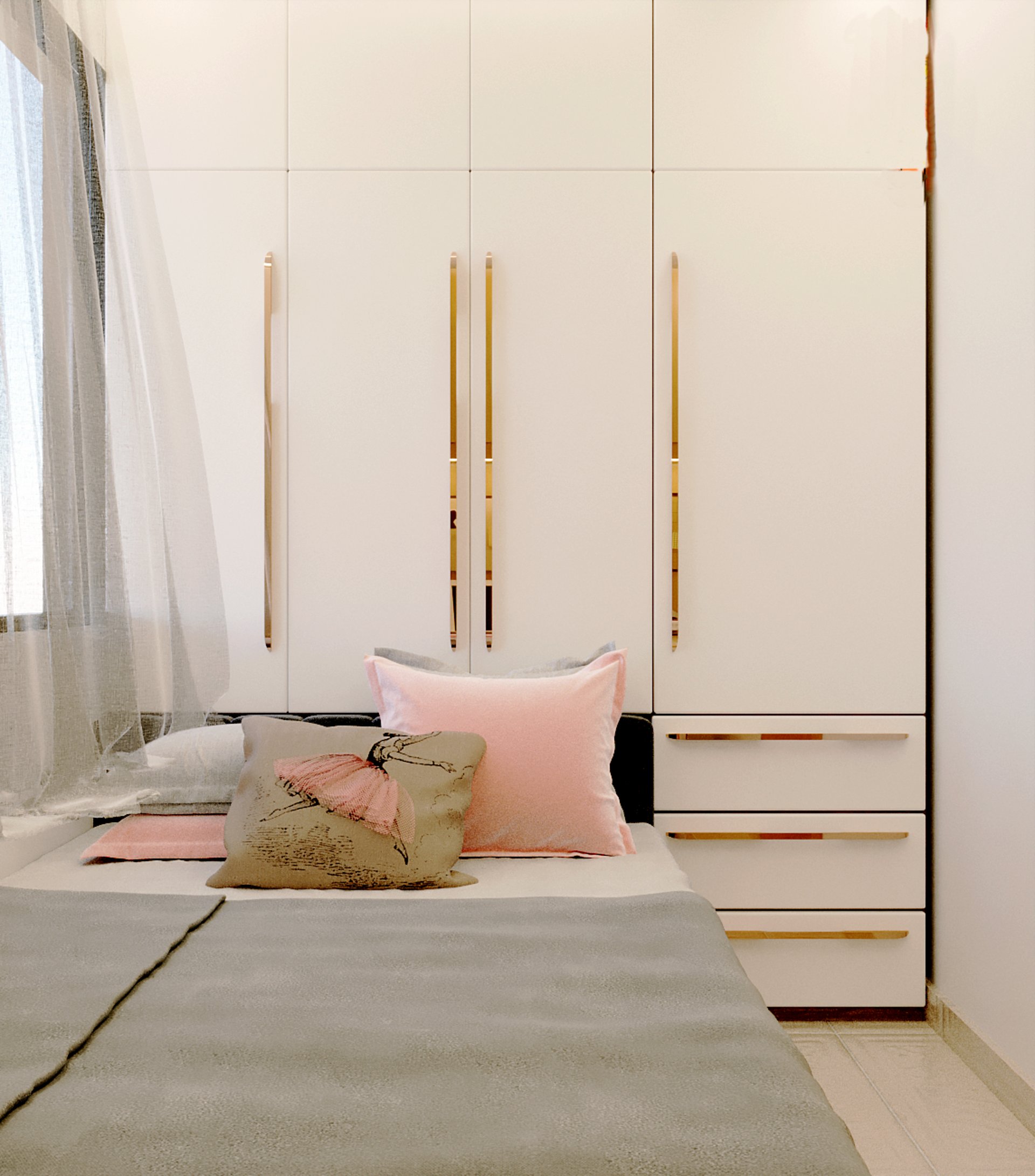 Quarto planejado para uma jovem, o ambiente não dispunha de muito espaço para se trabalhar, mas a disposição foi planejada de forma que mesmo o espaço sendo restrito, ficasse confortável e funcional. A paleta de cores foi escolhida de forma que se não desse sensação de enclausuramento devido ao pouco espaço, trazendo sensação de amplitude, e os móveis se tornam o charme do local, trazendo leveza, beleza e funcionalidade, aproveitando cada espaço do quarto de forma que não obstrua a circulação.