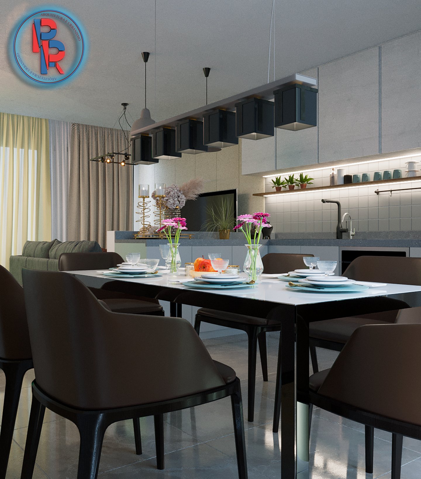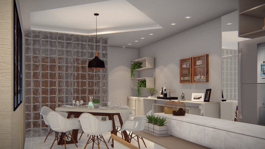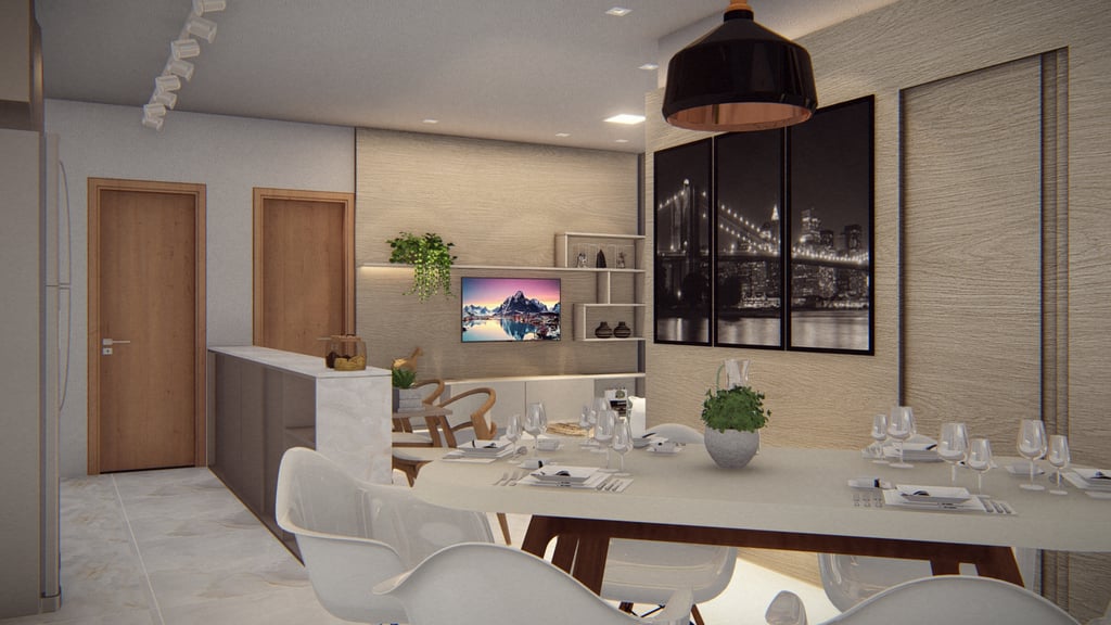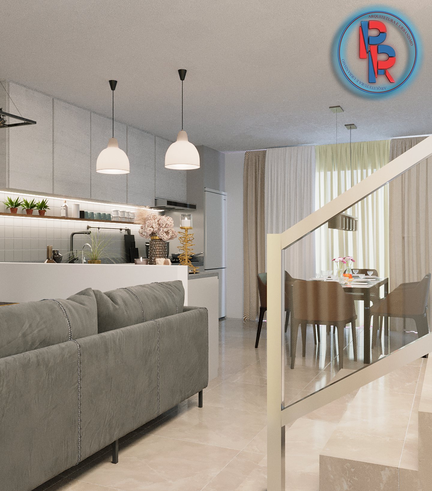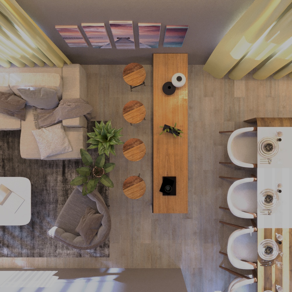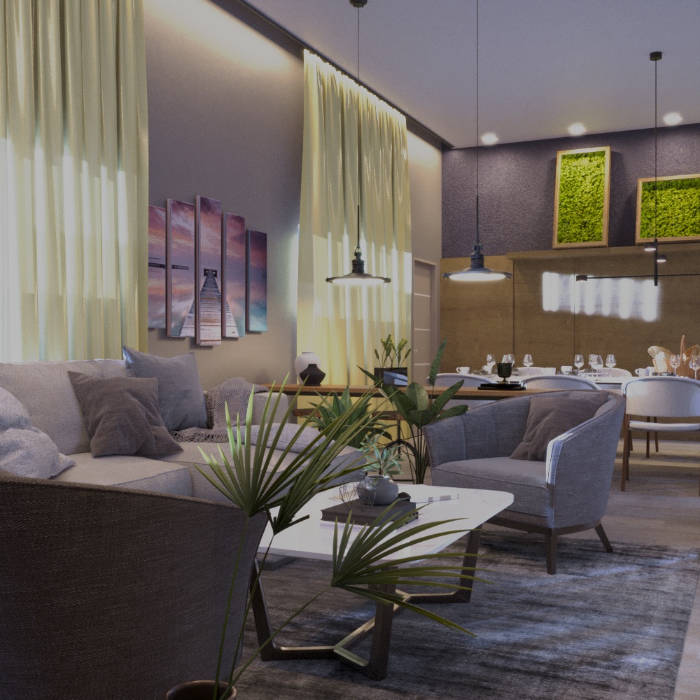 Arquitetura de Interiores para um ambiente integrado, onde a sala de estar, jantar e cozinha se comunicam. Foi desenvolvido o projeto arquitetônico anteriormente (também de minha autoria) e agora os projetos de arquitetura de interiores para complementar. Ambos foram planejados para conversar entre si, onde se tem o maior aproveitamento da iluminação natural, trabalhando com cores mais neutras, para dar um ar mais leve com a iluminação, também foram inseridas algumas vegetações para poder dar cor e trazer ambientes mais humanizados, em conversa com o natural, trazendo mais conforto e aconchego no local.