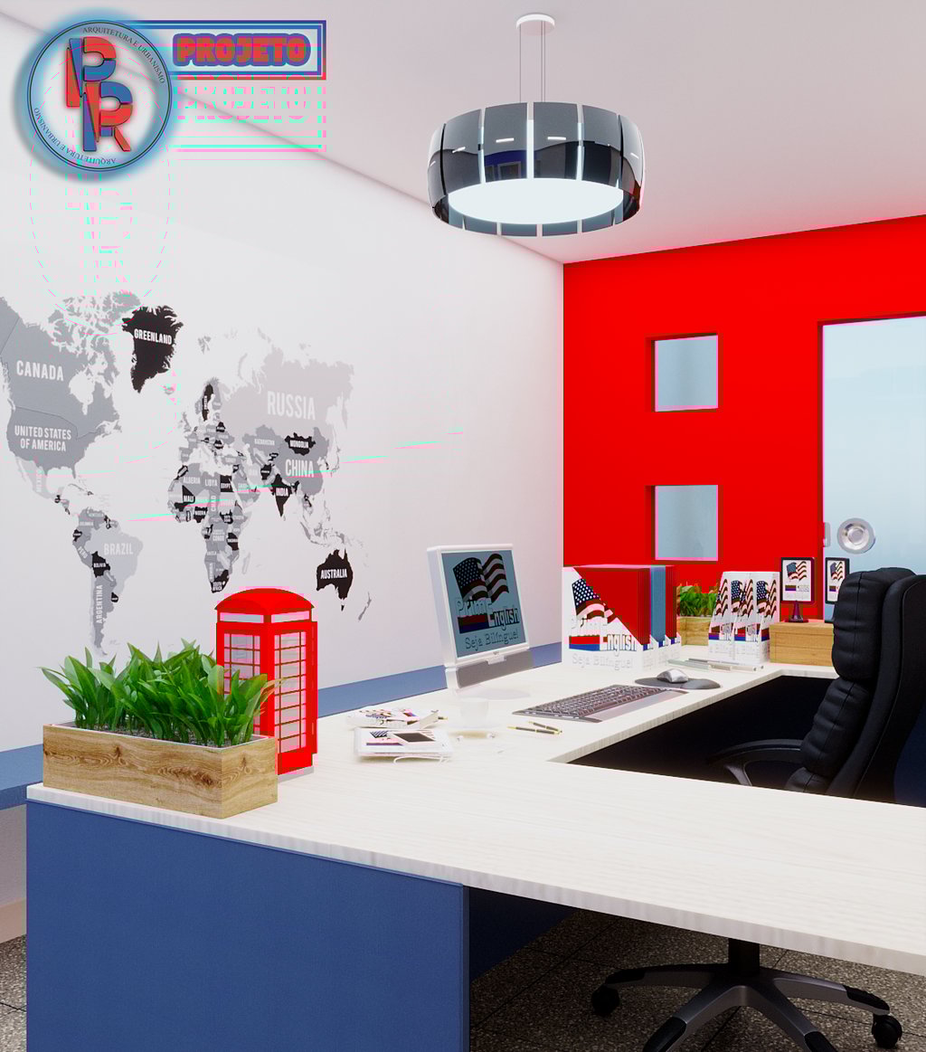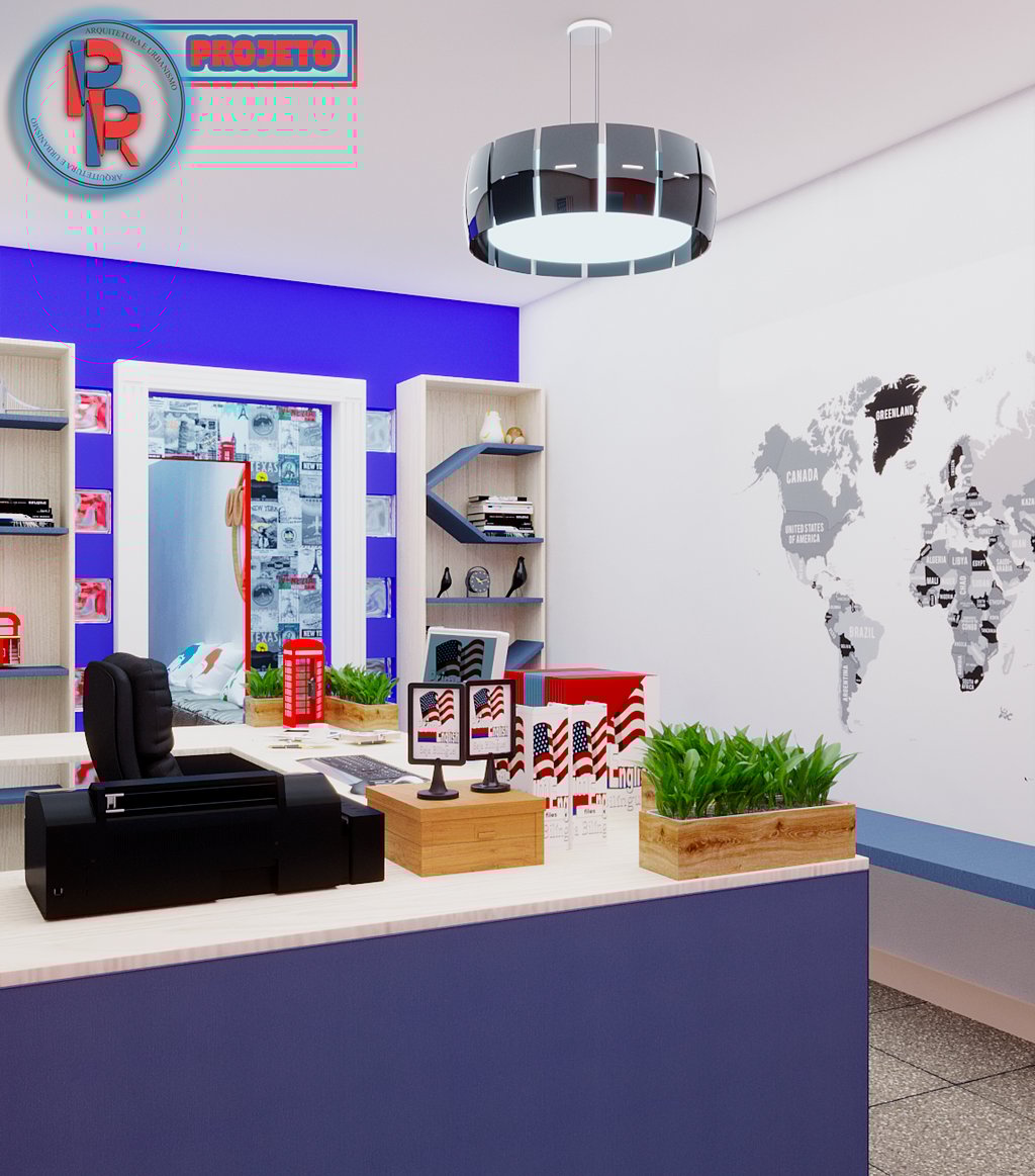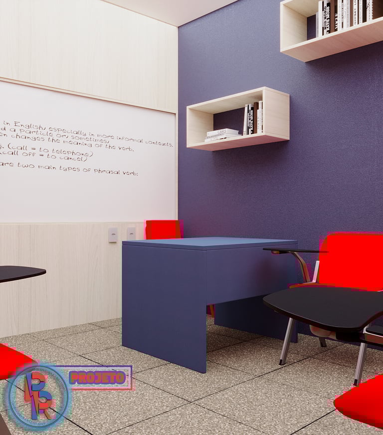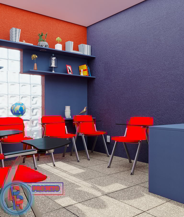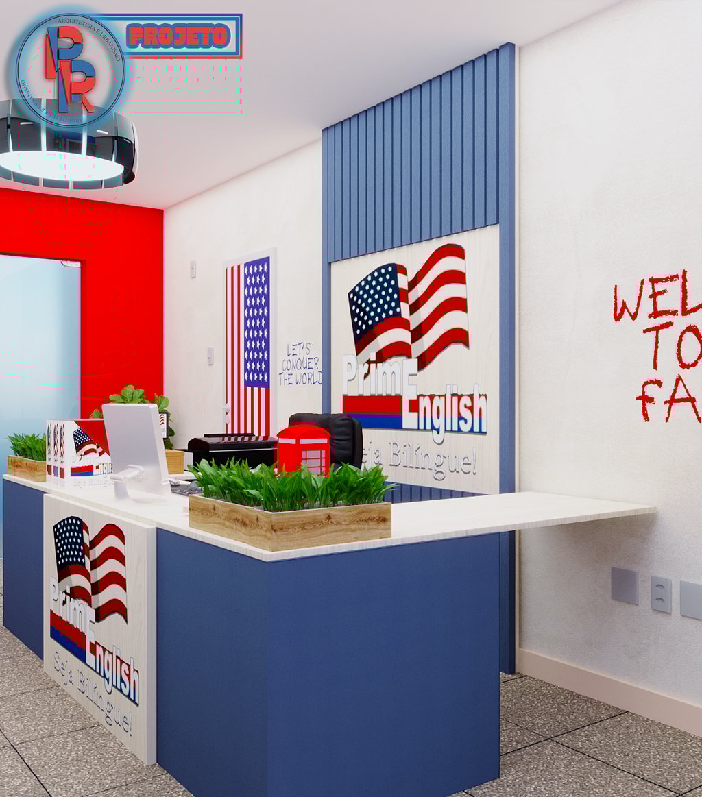 Esse projeto foi pensado para uma escola de inglês de Feira de Santana - Bahia, de forma que atraia a atenção dos alunos e dos que chegarem para se matricularem, o projeto foi pensado em trabalhar em cima da paleta de cores da logo da escola, para fazer referência e as pessoas associarem as cores a marca, com os móveis planejado pudesse otimizar e dar uma melhor funcionalidade ao espaço, sem intervenção física na edificação.