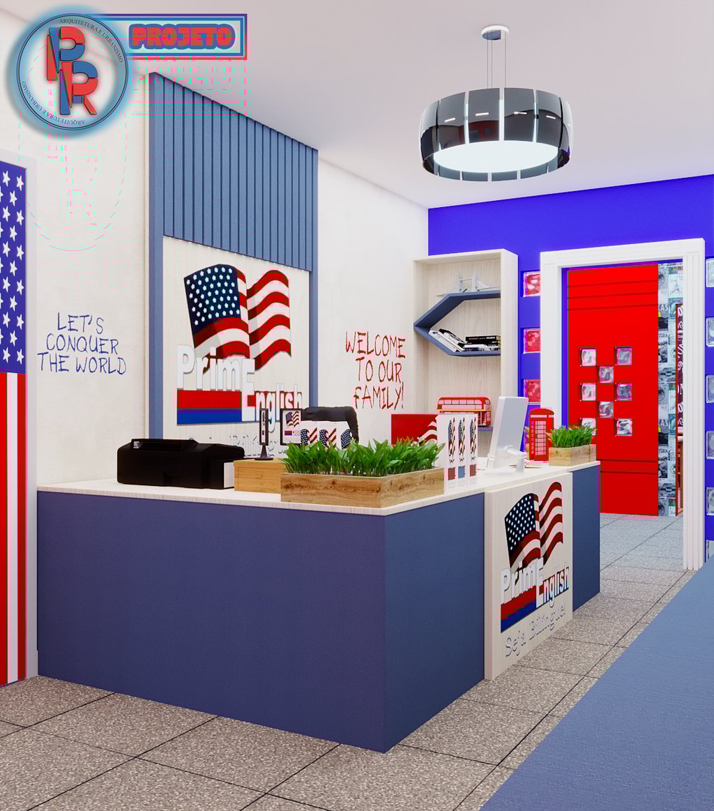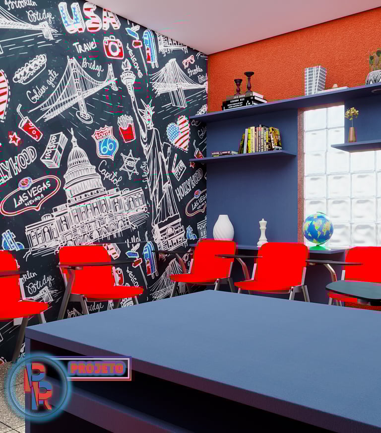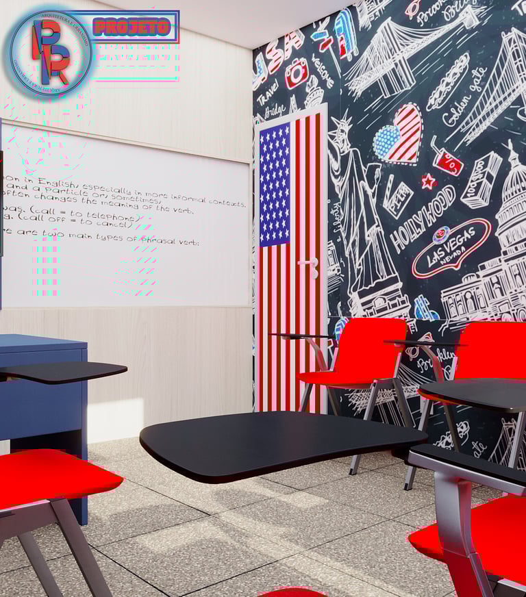 Projeto de Interiores para a Prime English School - Feira de Santana - Bahia - A sala de Aula 01 recebeu a temática do país, Estados Unidos da América, e todo o projeto foi desenvolvido em volta disso, as portas de cada sala foram plotadas conforme a temática planejada para ela, recebendo um papel de parede temático e uma painel de mdf para poder-se passar a elétrica, organizando melhor as tomadas e instalando novas, o quadro foi planejado para ficar centralizado entre dois painéis em mdf, foi planejado também um painel de correr que irá receber a tv, podendo ficar posicionado aonde for melhor conforme as posições dos alunos da sala e paleta de cores seguindo sempre o padrão de cores da logo. Essa sala os móveis em mdf foram pensado de uma forma que não obstruisse a passagem da luz natural.