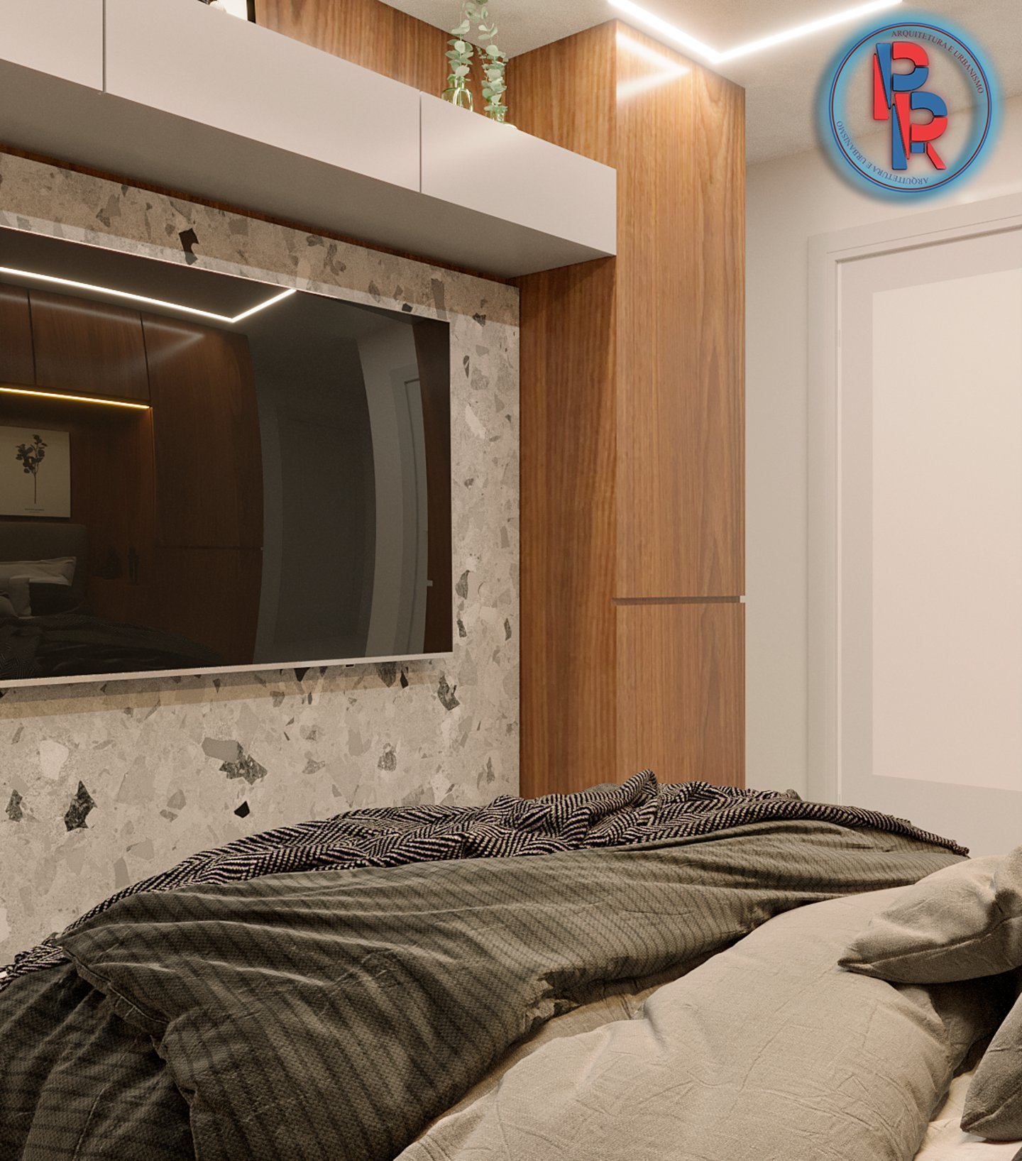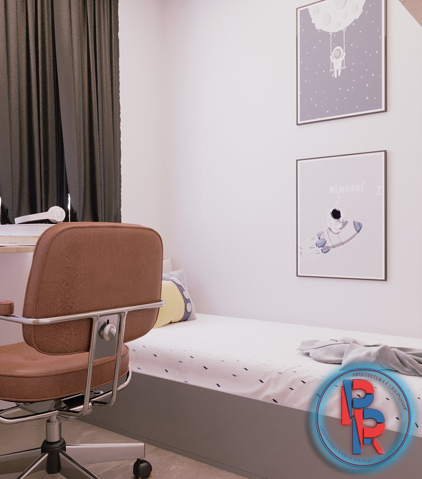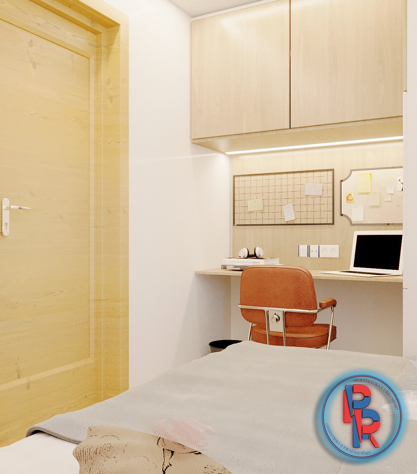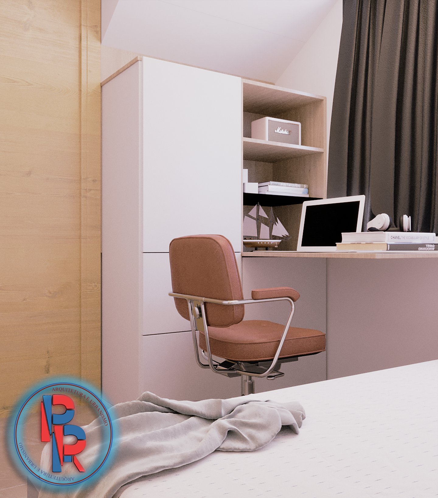 Projeto planejado para um jovem, o espaço era limitado e foi aproveitado da melhor forma possível, utilizando de armários nas paredes para poder se ganhar espaços de circulação, quarto também fica embaixo da escada e foi disposto o armário apropriado ao espaço que se tinha disponível. Todas as marcenarias foram planejadas nos mínimos cuidados, ficando ela como elemento que desse uma composição e não servisse só para aquela função, mas para que ficasse fazendo parte da obra.
