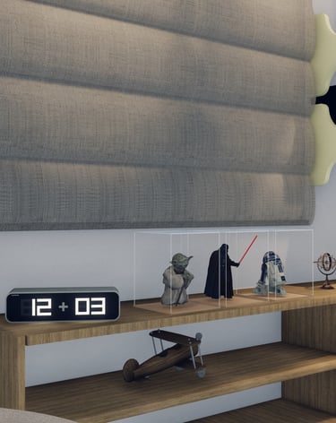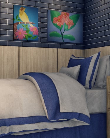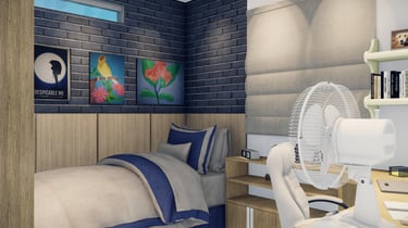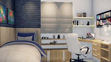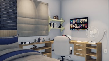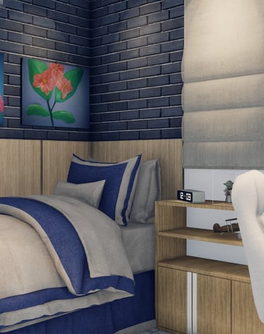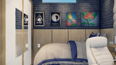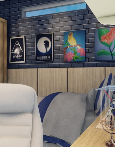 Projeto de arquitetura de interiores para uma intervenção no de um quarto de um jovem, levando em consideração o rústico e todo seu entorno em harmonia, pôsteres e pinturas já eram usados nessa parede, trazendo algo jovial e moderno, organizando o quarto da melhor forma possível para poder se organizar todos os seus pertences,