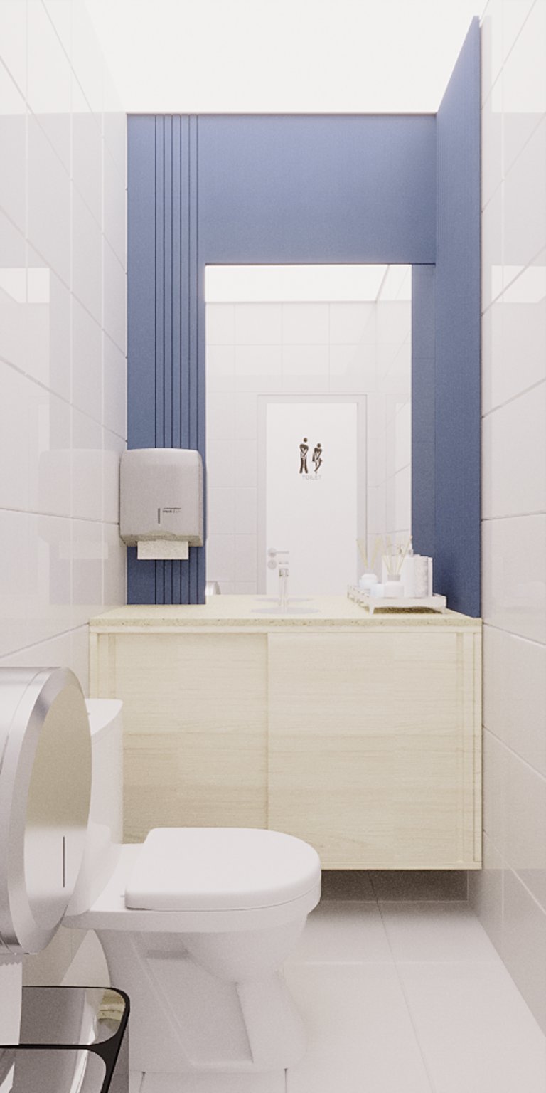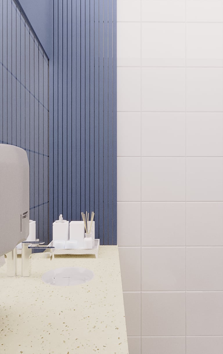 Projeto de Interiores para a Prime English School - Feira de Santana - Bahia - Esse lavabo foi planejado para trazer sofisticação, organização junto com uma paleta de cores neutras, trazendo referência a logo, mais uma vez trazendo essa associação a cor.