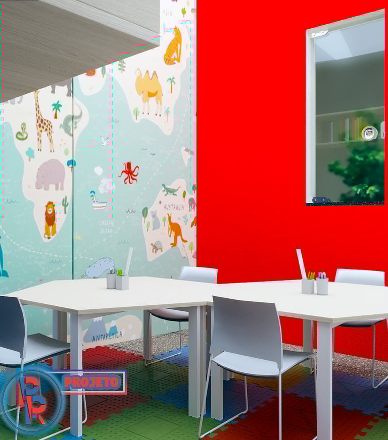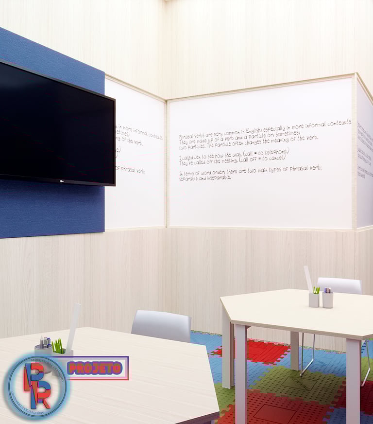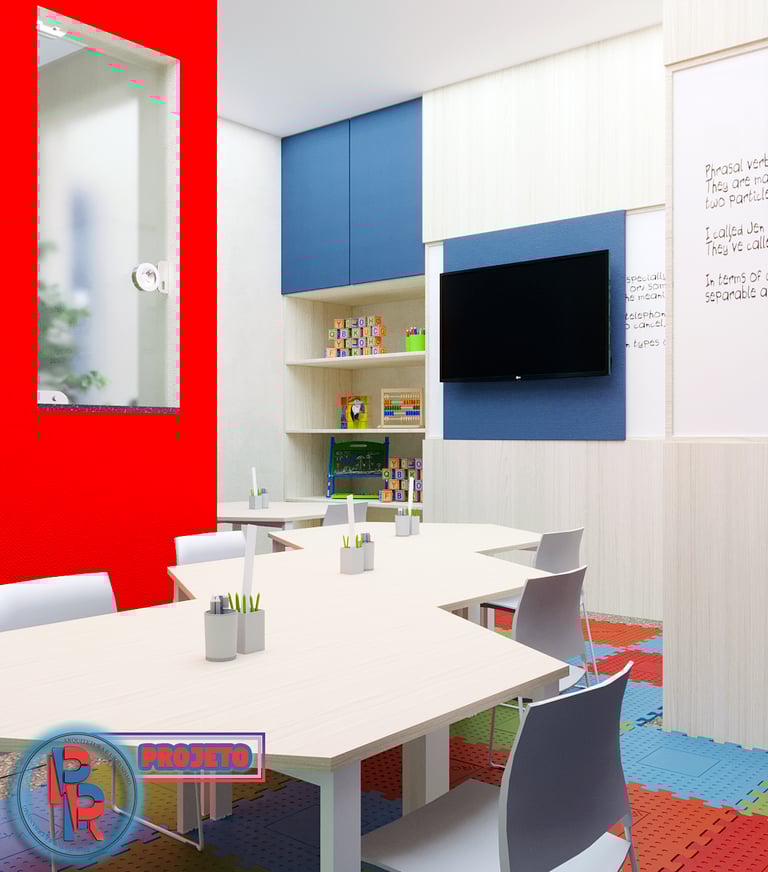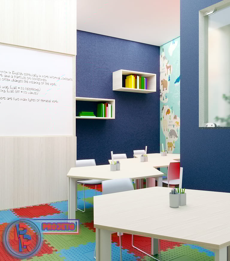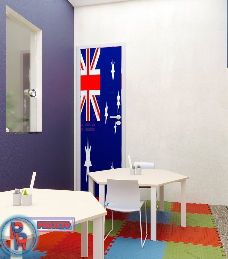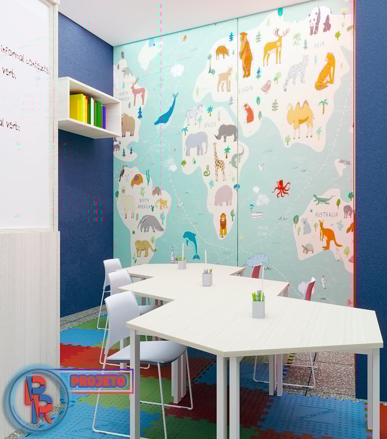 Projeto de Interiores para a Prime English School - Feira de Santana - Bahia - A sala de Aula 04 recebeu a temática do país, Austrália, e todo o projeto foi desenvolvido em volta disso, as portas de cada sala foram plotadas conforme a temática planejada para ela, recebendo um papel de parede temático e uma painel de mdf para poder-se passar a elétrica, organizando melhor as tomadas e instalando novas, o quadro foi planejado para ficar centralizado entre dois painéis em mdf, ao longo de três paredes para se ter visibilidade na sala inteira, foi planejado também um painel de correr que irá receber a tv, podendo ficar posicionado aonde for melhor conforme as posições dos alunos da sala e paleta de cores seguindo sempre o padrão de cores da logo, um dos locais onde foi aplicado o papel de parede com os animais que são referências em cada continente, é um painel com uma porta camuflada para esconder o acesso de um banheiro desativo, por se tratar de um local alugado não dá para se ter intervenções na estrutura, aí adotamos soluções para a situação, não obstruindo a passagem da iluminação natura, foi implementado o uso de piso emborrachado, com a temática de um parque infantill, devido a faixa etária da sala.