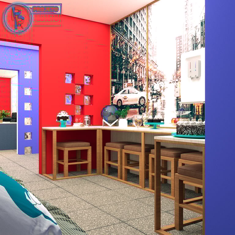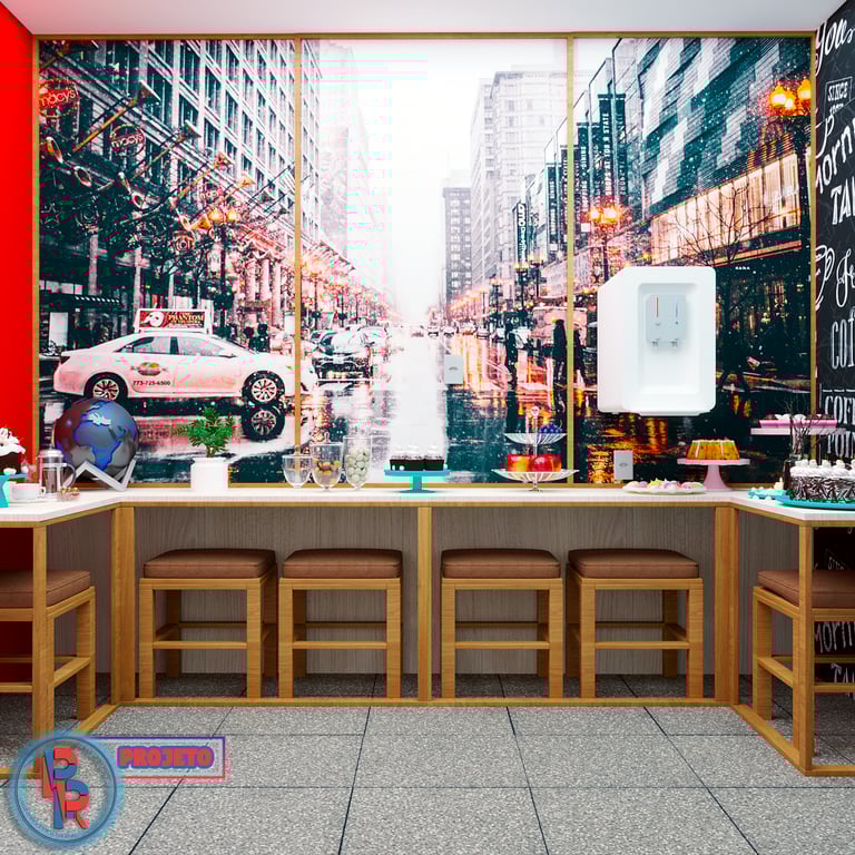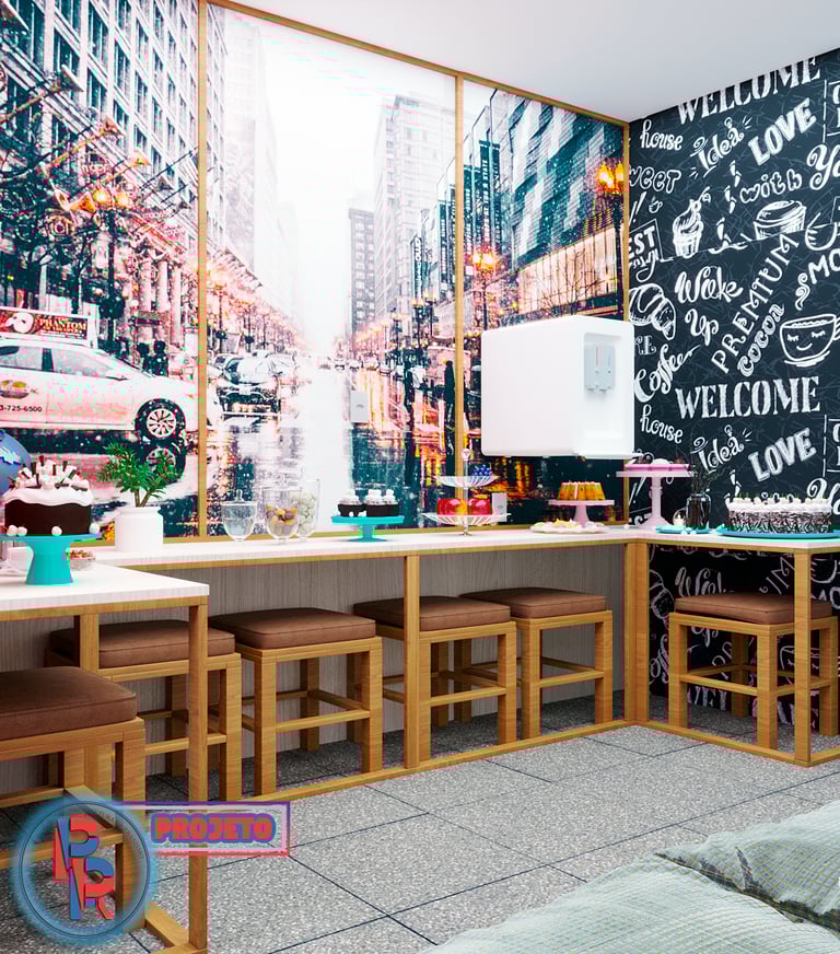 Projeto de Interiores para a Prime English School - Feira de Santana - Bahia - Ambiente Coffee Area - Esse projeto teve como referência as cafeterias que normalmente são vistas em filmes internacionais, onde se tem uma grande vitrine virada para rua (por isso o papel de parede com aquela temática), com um balcão com bancos para os clientes aproveitaram a sua refeição com algo incrível e vivo, que o tempo todo muda, que é o cenário da rua, um verdadeiro espetáculo, foi usado puffs para poder também ser um local de relaxamento e descanso durante o intervalo.