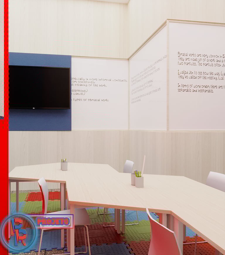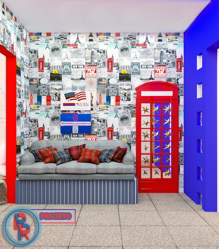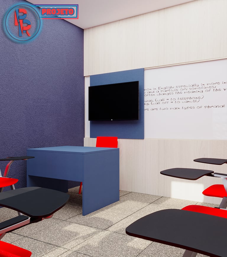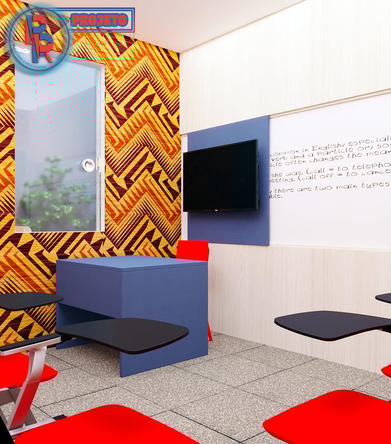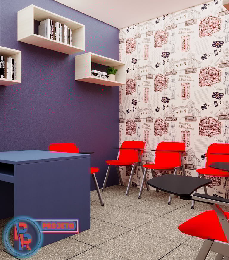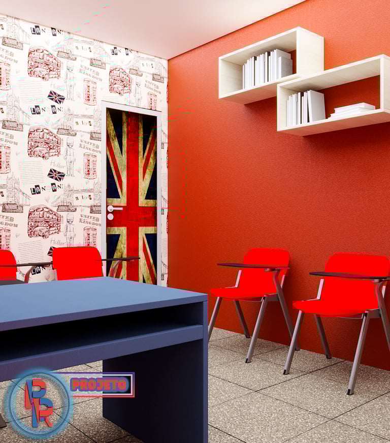 Projeto de Interiores para a Prime English School - Feira de Santana - Bahia - A sala de Aula 02 recebeu a temática do país, Inglaterra, e todo o projeto foi desenvolvido em volta disso, as portas de cada sala foram plotadas conforme a temática planejada para ela, recebendo um papel de parede temático e uma painel de mdf para poder-se passar a elétrica, organizando melhor as tomadas e instalando novas, o quadro foi planejado para ficar centralizado entre dois painéis em mdf, foi planejado também um painel de correr que irá receber a tv, podendo ficar posicionado aonde for melhor conforme as posições dos alunos da sala e paleta de cores seguindo sempre o padrão de cores da logo, o local onde foi aplicado o papel de parede é um painel com uma porta camuflada para esconder o acesso de um banheiro desativo, por se tratar de um local alugado não dá para se ter intervenções na estrutura, aí adotamos soluções para a situação.