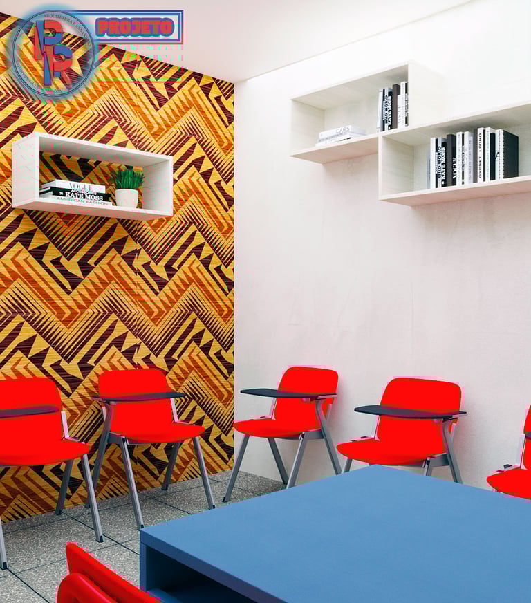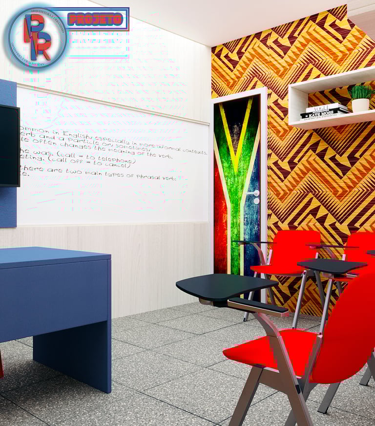 Projeto de Interiores para a Prime English School - Feira de Santana - Bahia - A sala de Aula 03 recebeu a temática do país, South Africa, e todo o projeto foi desenvolvido em volta disso, as portas de cada sala foram plotadas conforme a temática planejada para ela, recebendo um papel de parede temático e uma painel de mdf para poder-se passar a elétrica, organizando melhor as tomadas e instalando novas, o quadro foi planejado para ficar centralizado entre dois painéis em mdf, foi planejado também um painel de correr que irá receber a tv, podendo ficar posicionado aonde for melhor conforme as posições dos alunos da sala e paleta de cores seguindo sempre o padrão de cores da logo, um dos locais onde foi aplicado o papel de parede é um painel com uma porta camuflada para esconder o acesso de um banheiro desativo, por se tratar de um local alugado não dá para se ter intervenções na estrutura, aí adotamos soluções para a situação, não obstruindo a passagem da iluminação natural.
