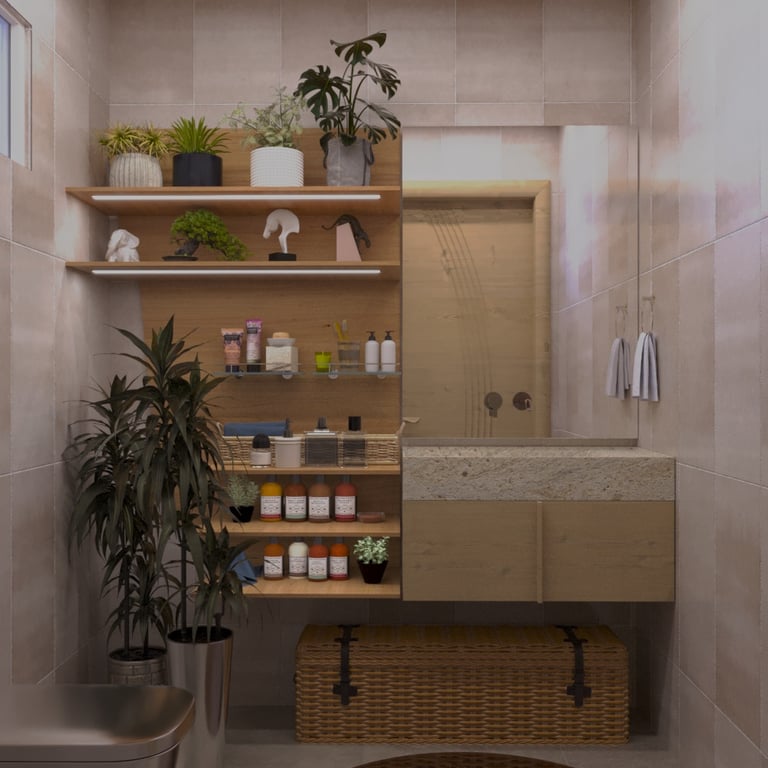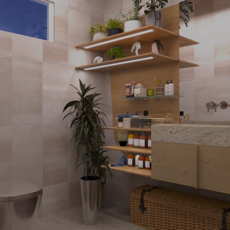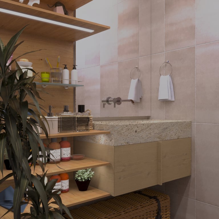 Lavabo planejado para se trazer conforto, aconchego e um local agradável para uso. Foi utilizado móveis planejados para melhor aproveitamento do espaço restrito, acrescentei também as vegetações para tornar o ambiente mais humanizado e harmônico com os móveis.