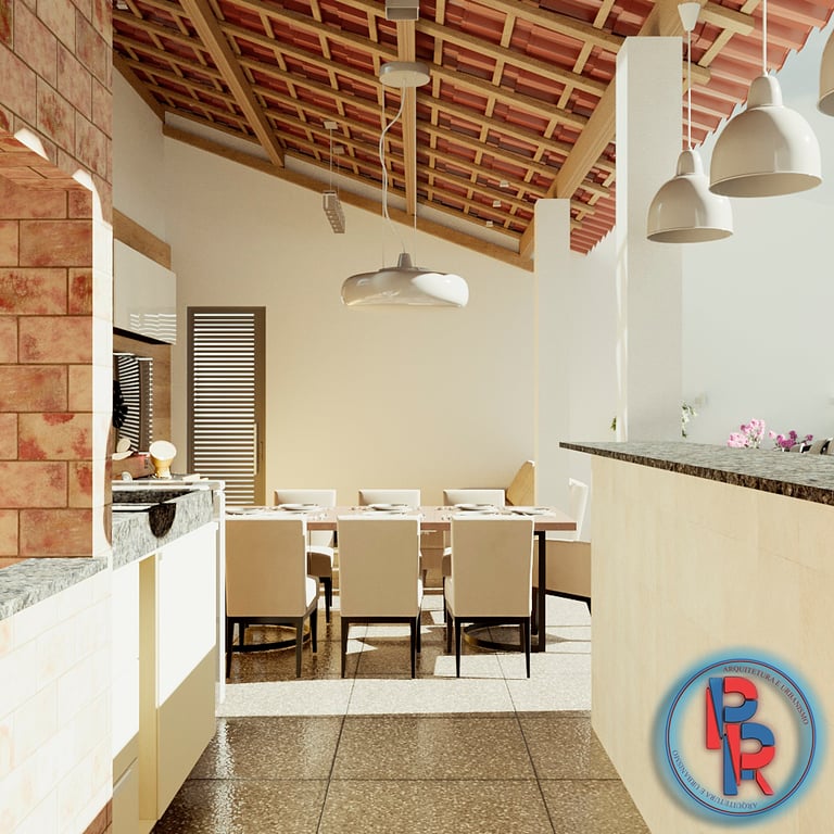 Área Gourmet - Foi planejado para ser inserido no lugar de um antigo anexo que tinha nos fundos da casa, de forma que fosse um espaço para diversos tipos de lazer, sendo um local de conforto e permanência, onde irá trazer mais união a família, alegria de vivacidade a família, através do ambiente rústico, refrescante e belo.